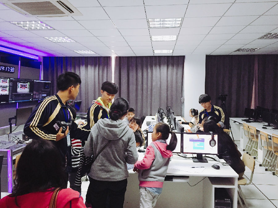 媒体小主人,由潘雨沛老师主负责,数字媒体的两个实训室非常的高大上,此项目主要由新闻模拟播报、新闻坊、虚拟拍摄、后期特效合成、媒体发布等子项目组成,通过体验可以了解数字视频采、编、播流程和后期特效,直观地了解到影视出版产品的制作流程和现场直播等技术环节。这是每个中小学生必来的项目,可以参与配音和节目录制,并且可以在事后拿到装有自己照片的U盘。