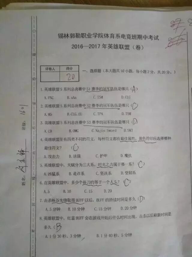 在今年9月份,教育部正式宣布高等职业学校增设电子竞技专业后,瞬间受到了许多喜爱玩游戏的学生追捧,电子竞技专业也成了热门专业之一。之前我们报道过有一所职业学院据称已经开设了电竞专业,近日,一位来自这所职业学院的同学就曝光了一份LOL的期中考试题,让我们一起来看一下,电竞专业的考题到底难不难?