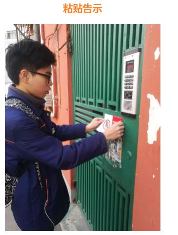 另外的志愿者则是在小区内张贴禁止燃放烟花爆竹的告示。由于告示需要贴在小区居民楼内,而居民楼下都有一道防盗门,我们没有钥匙,所以我们只能通过门禁的电话让居民帮忙开个门。小区居民都很配合我们,还有几位附近散步的老爷爷看见我们在贴告示,纷纷自告奋勇的带着我们去自己家的楼道中贴告示,他们对于我们工作的支持着实让我们很感动。