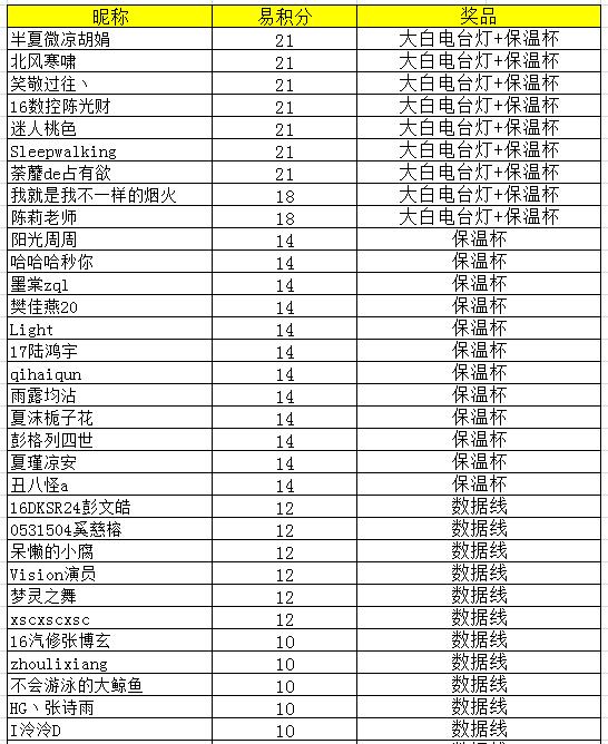 即日起至12月4日,在论坛中举办8个版块联合活动,本次版块联合活动易积分排名前三的同学可获得提供的大白电台灯一个,前十可获得易班保温杯,更有20个易班数据线、鼠标垫随机附送。礼品多多快来参与吧~!