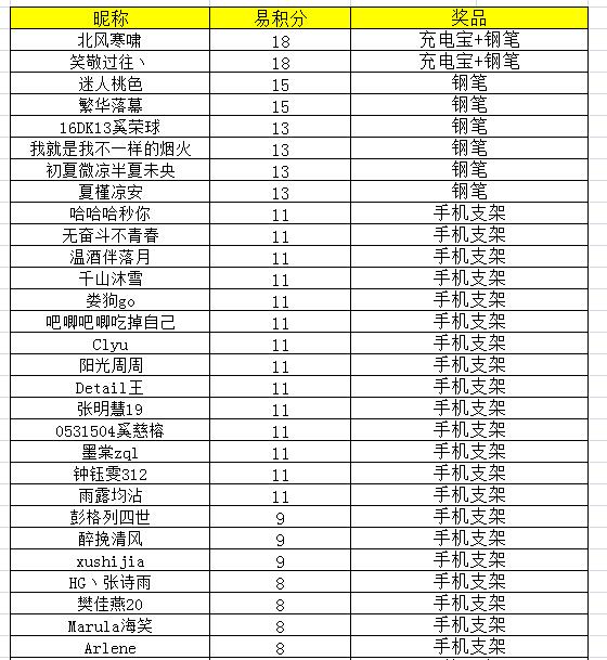 即日起至12月18日,在论坛中举办7个版块联合活动,本次版块联合活动易积分排名前三的同学可获得提供的充电宝一个,前十可获得钢笔一支更有20个易班笔记本、手机支架随机附送礼品多多快来参与吧~!