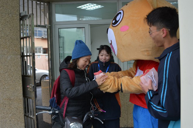 3月8日早上7点20分易班工作人员在部长李泽坤的带领下换上易班熊服装,与外联部的同学们一起为辛苦授课的女教师们送上学生亲自制作的精美礼物和暖暖的祝福。礼物虽小,但是每个小小的礼物都包含着同学们老师的一片敬爱之情。每个收到小礼物的女教师脸上都洋溢着甜美的笑容。行政楼的大荧幕上也用粉红色花瓣背景展现了三八妇女节的氛围。现场,还有不少教师主动和可爱的易班熊留影合照。整个校园门口都洋溢着欢乐和幸福。