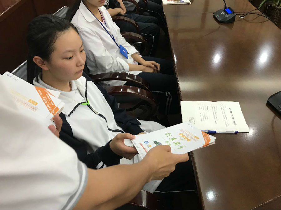 劳模班的同学们制作的安全手册很小,仿佛几秒就能看完,但如果做起来很难,册子的封面有四服务“服务同学,服务老师,服务校园,服务社会”打开册子第一面是劳模班的同学们写的暖心的话,特意用黑体字标出重点,还有《图解女子防身术》,第二页说因为打车事件,上海大众出租车在5月18日成立了首支女性乘客专享服务车队,不同于传统出租车的是,大众“玫瑰之盾”车队有显著的玫红色丝带标志,司机也有严格的要求,必须是以党员、班组长为主,每个人至少要有三年以上的安全服务为“零违纪”记录,而且这支车队优先女性乘客,册子反面的问题和回答也很温馨…