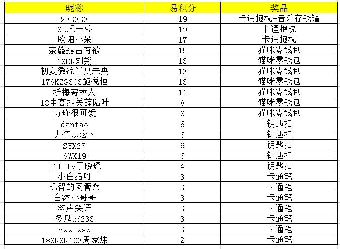 即日起至12月2日,在论坛中举办7个版块联合活动,本次版块联合活动易积分排名前三的同学可获得卡通抱枕一个(第一名:音乐存钱罐),前十可获得卡通零钱包一个更有20份钥匙扣、卡通笔、游戏卡贴随机附送礼品多多快来参与吧~!