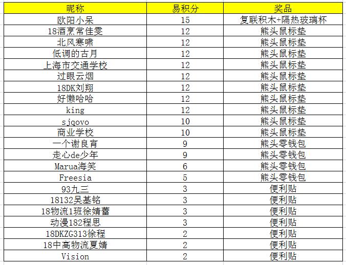 即日起至3月15日,在论坛中举办7个版块联合活动,本次版块联合活动易积分排名前三的同学可获得复联积木一个(第一名:隔热玻璃杯),前十可获得熊头鼠标垫一份,更有20份便利贴、围巾随机附送。礼品多多快来参与吧~!