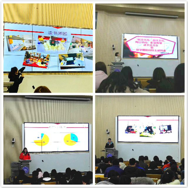 班会分为“新学期新气象”、“行万里路,读万卷书”、“畅游书海,品味文化”三部分。第一部分,由班长顾磊与刘夏毓回顾班级情况,用班级数据说话,发现学霸和全面发展的同学都是有良好的读书习惯、有坚定的追求、有敬业勤勉的优秀品格,由此,班长们勉励同学新学期树立新目标,多读书滋养浩然之气。