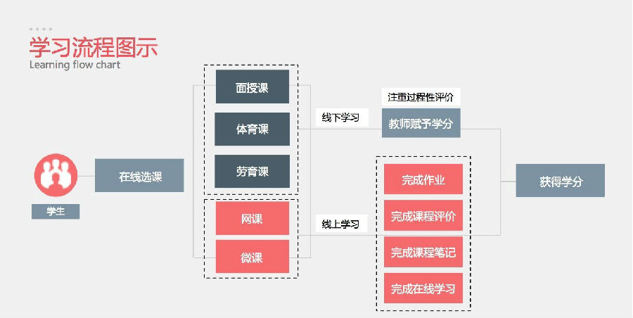 二课堂课程分为人文素养、专业拓展、体能素养、心智礼仪、网络课程、微课等系列。微课又分有商贸通识、心智礼仪、美育体育、趣味外语、信息技术和文史常识、职业技能7类,形成错落有致、形象丰富的教学资源库。其课程体系分为两大类四门课程,分别是线上的微课程、网络课和线下的实体面授课以及社会实践,这四门课程同学均需参加且修满相应学分。学习流程图如下: