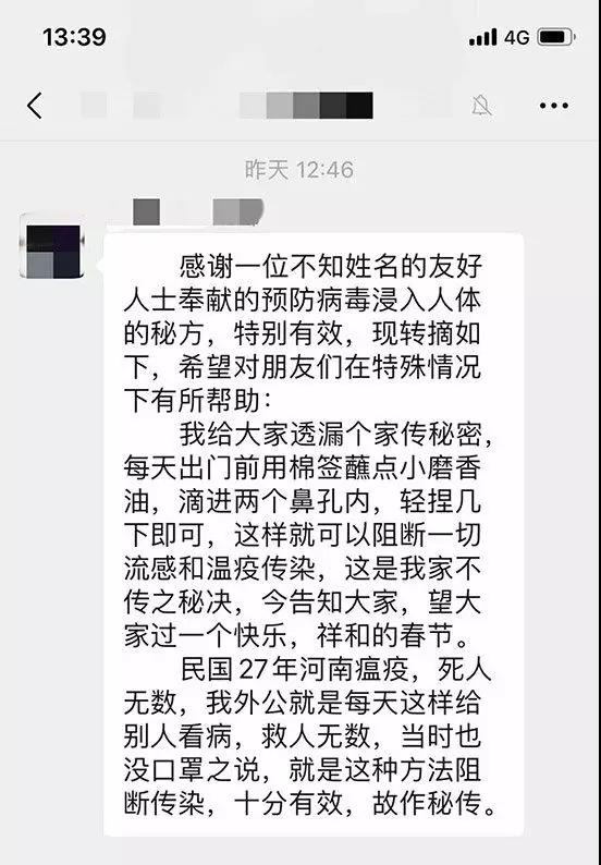 谣言六: 出门前用棉签蘸香油滴进鼻孔内,轻捏几下即可阻断流感和瘟疫传染