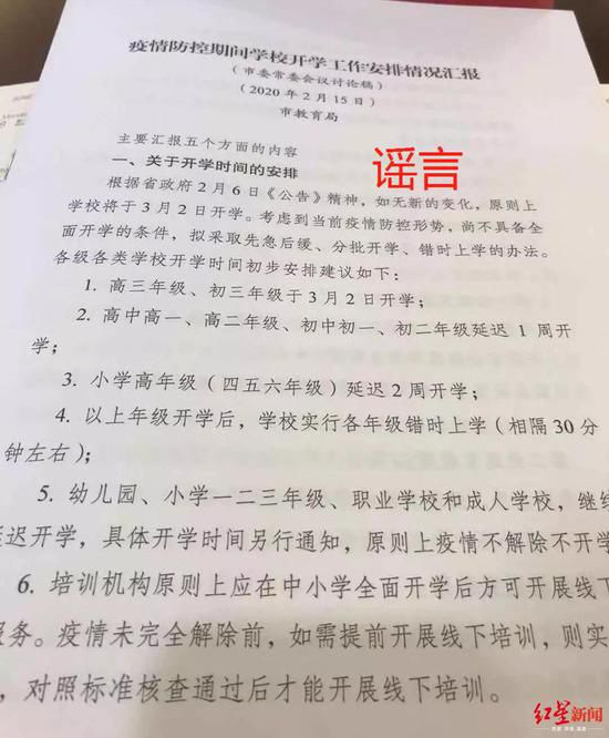 很多家长在群里看到这个消息,信以为真,都感觉“看到了盼头”。对于上述内容,红星新闻记者向各市教育局求证了解到,该“情况汇报”与成都市我们、济南、杭州、合肥、福州、莆田并无关系,大多省市的回答都说根据当前疫情发展形势,全省各级各类学校(高校、中小学、中职学校、幼儿园、校外培训机构)2020年2月底前暂不开学。具体开学时间将视疫情防控情况,经科学评估后确定,届时提前向社会公布。