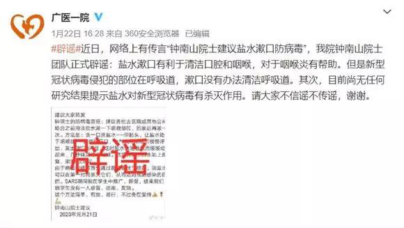 近日,网络上有传言“钟南山院士建议盐水漱口防病毒”。对此,广州医科大学附属第一医院官方微博发布消息,我院钟南山院士团队正式辟谣: