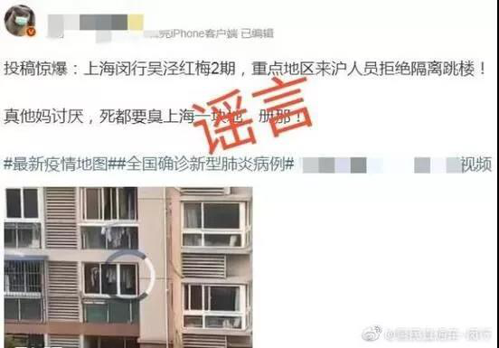 2月11日,一条“湖北人拒绝居家隔离在闵行区吴泾镇一小区跳楼”的视频出现在网络社交平台,但此事并没有得到核实就在多个微信群中转发扩散,引起很大的轰动。