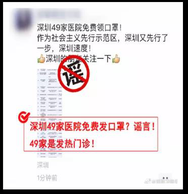 近日,有网友发帖称“深圳49家医院免费领口罩”。日前,深圳市针对新型冠状病毒肺炎疫情,于是公布了49家发热门诊地址和名单。方便民众了解情况并如果有发热等现象及时就医。但经过两天传播,有的网友对此产生了误会,在微博上发布深圳49家医院免费发放口罩的信息,导致一些市民前往医院领取口罩时落空。并对49发热门诊造成了不良影响。