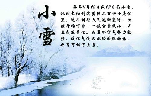 小雪是二十四节气中的第20个节气,也是反应气候特征的节气,日期在每年公历11月22日或23日。