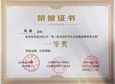 2021第三届全国中学生日语优质课评比大赛成绩近日揭晓,我校日语教师钱犇脱颖而出,荣获全国一等奖。