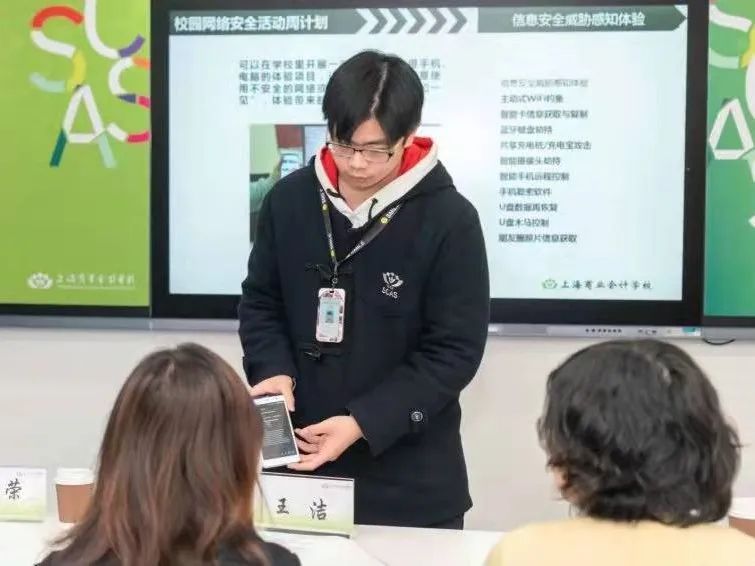 上海师范大学教育管理系主任关晶、公安第三研究所教育基地支部副书记、研究员何晓霞、上海市工商外国语学校副校长杨菁、上海商业会计学校副校长王洁、范荣,企业专家张月红副教授、陈峻博士,企业技术总监张政康,网络信息安全专业部分教师及学生代表参加此次汇报。
