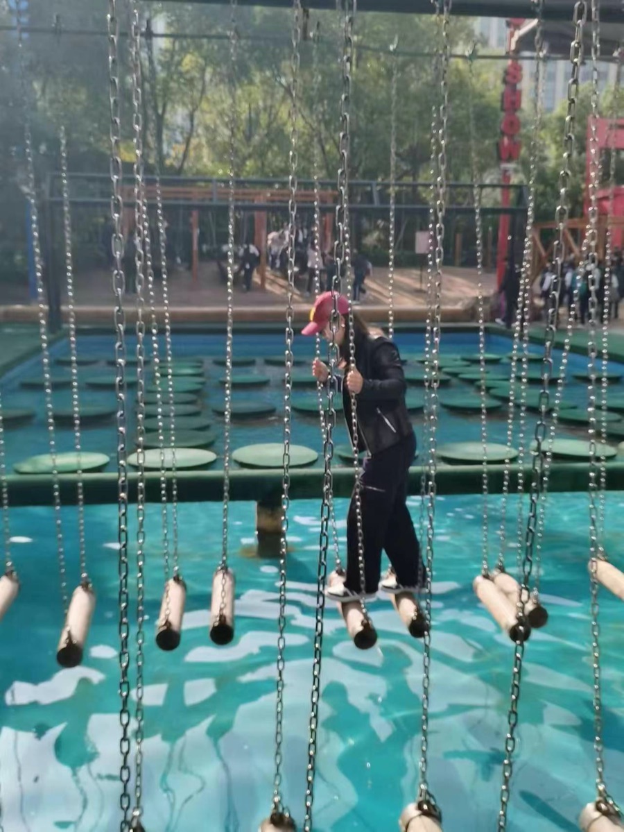 到达目的地后,同学们根据自己的兴趣、喜好和体力游玩。大家三五成群,欣赏自己心仪的景点,喜欢拍照的同学们更是不放过每一处美景,拍照留念。有的同学兴致勃勃的去往虚拟空间,有的同学结伴而行一同去往了鬼屋,然而,有的同学还是被一旁的嬉水区吸引了目光,吊着的木桥,浮在水上的垫子,这样的项目让同学们都起了挑战心理,我们班的班主任顾老师先给我们班的同学打了样,踏上木桥,一鼓作气,不一会儿就通过了木桥,同学们顿时来了兴趣,一个接着一个挑战自我,虽然不少同学都因此湿了衣服,但却带来了很多欢乐和笑容。