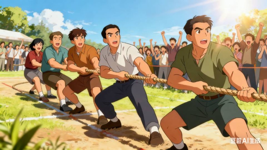 当比赛的哨声响起,紧绷的绳索成为双方力量的焦点。队员们紧握长绳,身体后倾,双脚紧扣地面,每一寸进退都凝聚着全队的汗水与决心。场边的呐喊声、助威声此起彼伏,仿佛一股无形的力量注入绳中,推动着队员们全力以赴。这一刻,个人的力量或许微小,但集体的合力却足以撼动山河。