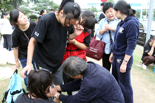走近操场,真可谓是“黑压压”的一片---身着黑色、印有“跋涉六十里,走向大学城”字样T恤的学生与老师正三五成群地凑在一起或认真察看学校下发的路线图,或讨论着马上将开行的最佳方案。向往、期盼、兴奋、激动之情溢于每个人的言表。