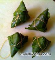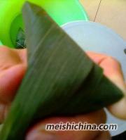 9、把尾部拉过把米遮盖住看图,粽叶绕缠着。