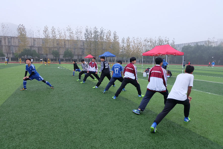 2015年11月22日,我校前往工商信息学校和上航技校的球员进行了一场足球比赛。当日虽然阴雨绵绵,但这并没有阻挡住同学们的热情。我方球员在操场上积极地做着赛前准备。