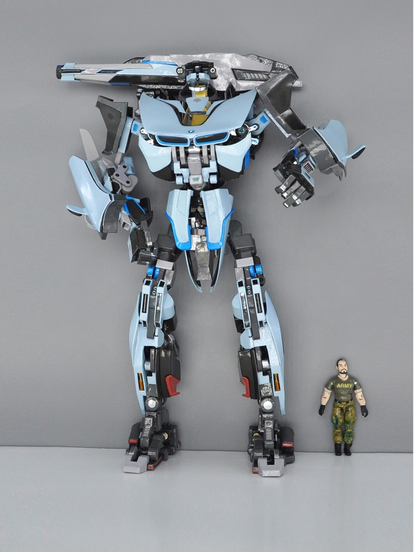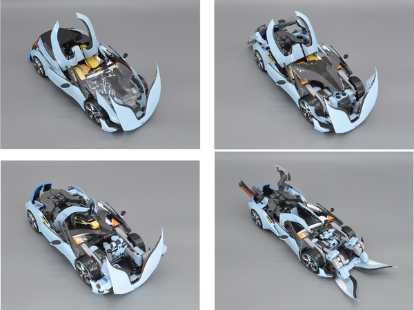 可能你会以为这是一辆普通的车模,但其实这是一辆纸模汽车,甚至还能完成变形,下图就是它变形后的样子,同时作者还考虑了其运作方式为它配备各种变形武器!